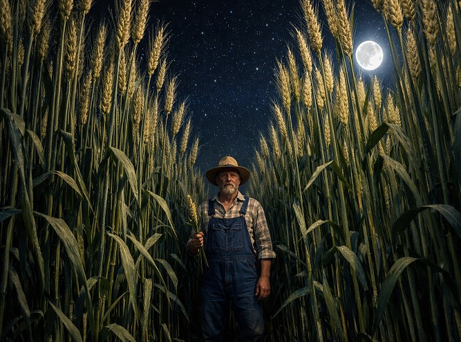 Why did the farmer feel uncomfortable in the wheat field at night?